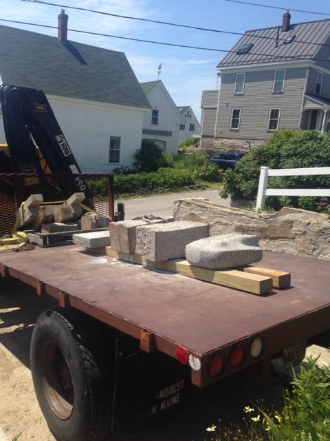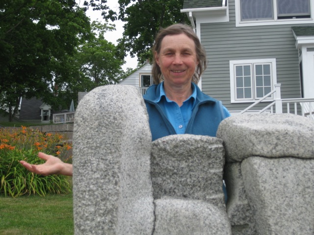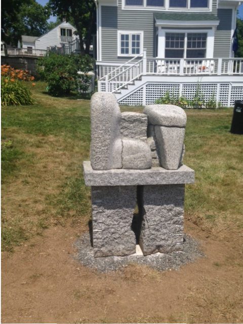 The idea of placing Roy Patterson’s sculpture on that site grew on me gradually as I passed by it year after year, season after season, sitting there in the dooryard of the Turtle Gallery in Deer Isle. I never really decided to; it just seemed more and more obvious that the piece would fit perfectly there. It is solid and familiar, built of the very granite blocks and shapes that all the walls up and down School Street are built of, including the one it sits atop. So it dialogues well with the natural world here, and with our local history and heritage. But it has another level of meaning as well, much more subtle, allusive and archetypal.
