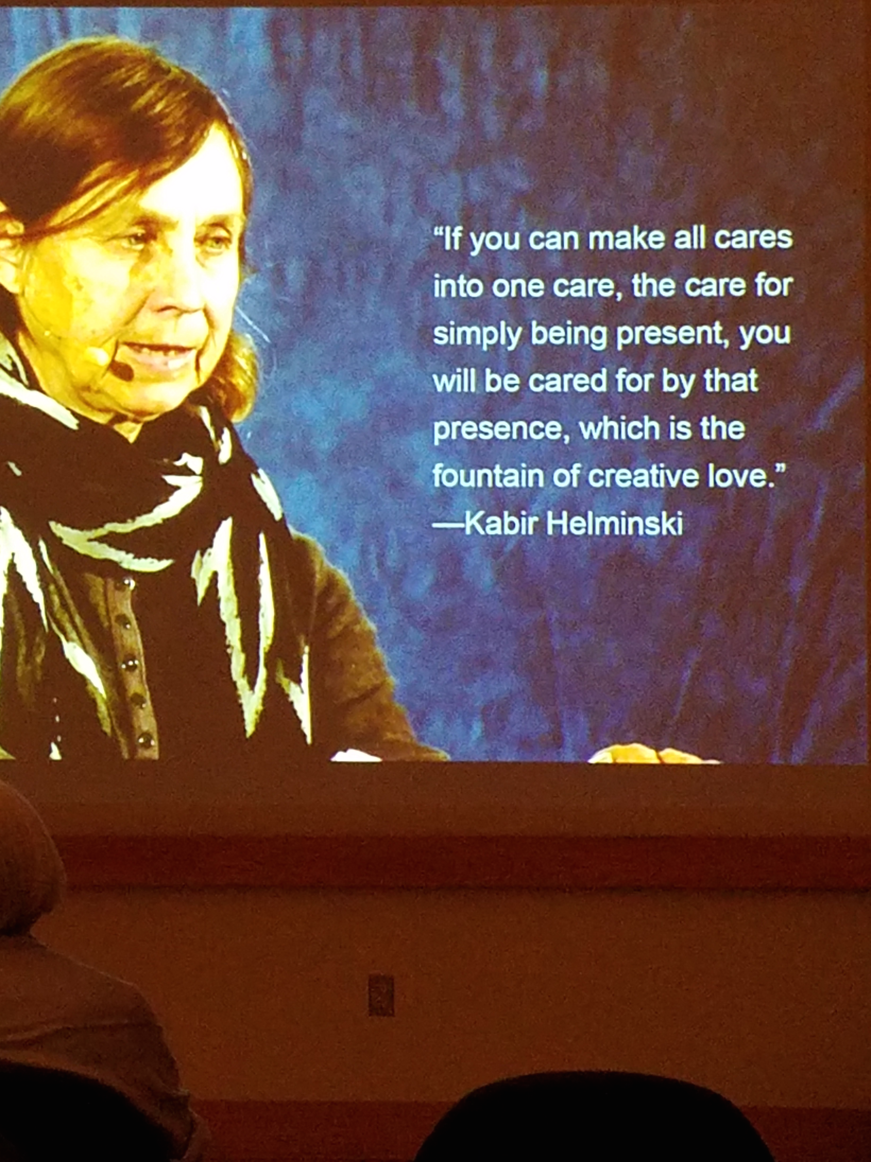 - Periodically, when a quote on the screen was particularly poignant, the group asked to ‘hold that slide’ for a bit …digesting it’s impact, writing it down, taking a picture of it. At one point, our group broke into chant as we paused and held a particular slide on the screen. These ‘pauses’ to breathe were poignant and powerfully deepening, a surprise ‘grace’ of video teaching.