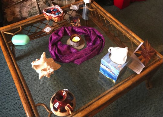 The candle, tissues, and chocolate are pretty obvious but how did our small Midwife group’s altar end up including a lamp, a shell, and a bar of soap? Wouldn’t you like to know!