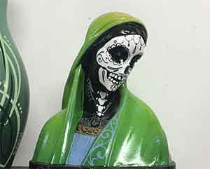 Days later, in a shop in Amiens, I spotted this image of the Dark Madonna—Our Lady of the Dead. (Actually, “Nuestra Señora de la Santa Muerte,” Our Lady of the Holy Death; celebrated as a Mexican folk saint, in my mind she is fused with the Mother herself—one of her many and most profound faces.) And of course, she was robed in green. Our Lady of the Dead is Our Lady of Life. Really, there is no death—only the resurrection of the body and life everlasting.