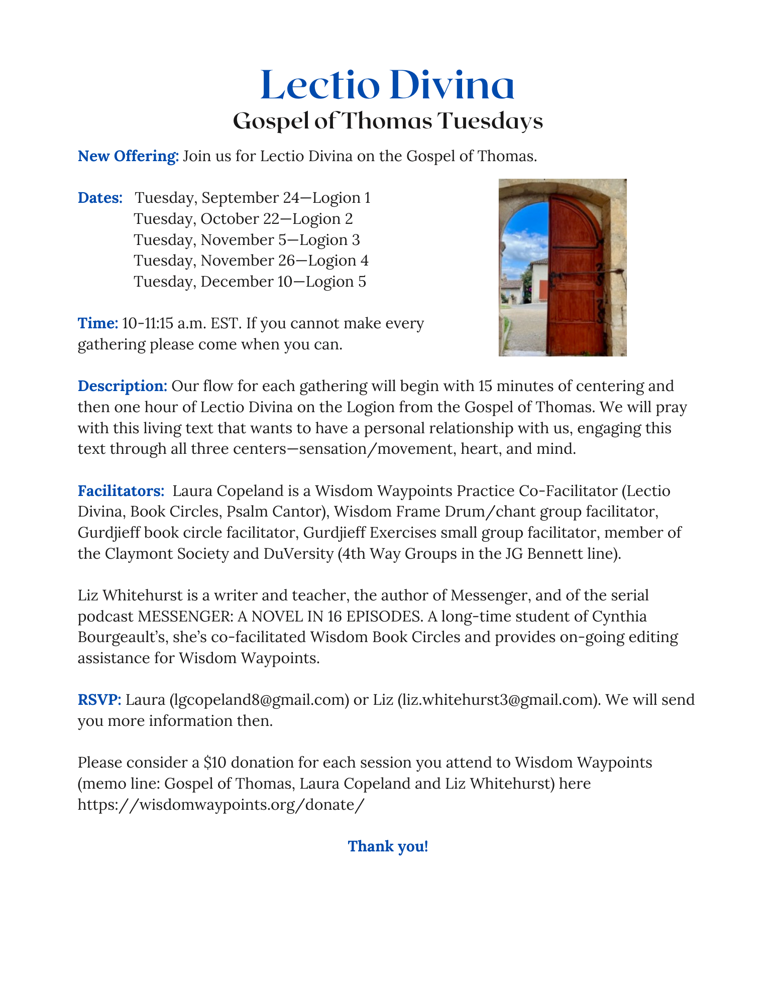 This fall, Wisdom Waypoints is pleased to showcase a new series of Gospel of Thomas Lectio Divina gatherings hosted by seasoned Wisdom students within our network.