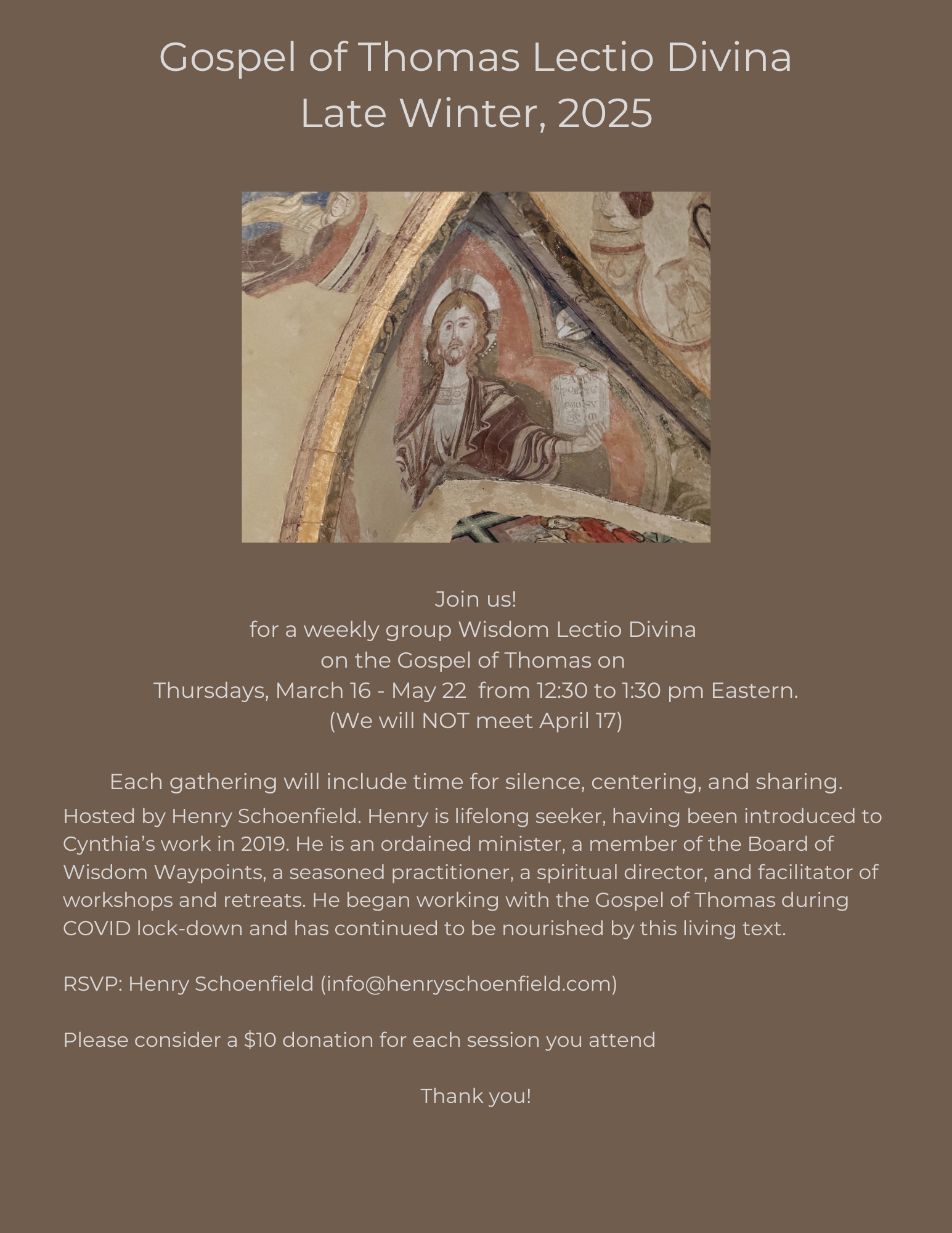 This winter, Wisdom Waypoints is pleased to showcase a new series of Gospel of Thomas Lectio Divina gatherings hosted by seasoned Wisdom students within our network.