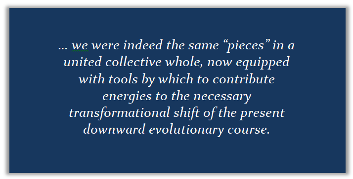 In 15 fascinating and transmission-filled teachings and with her imminent storytelling skills, Cynthia recounted the never-ending evolutionary development of “Worlds” and Consciousnesses – from the unmanifest energetical through to the light Imaginal, the heavy earth realms and beyond, and their complex upward and downward dynamisms. Suddenly, as by a stroke of magic, all of it became a vivid and living reality. And so, things so difficult to fathom with an earthbound linear time and “material” causality perspective swiftly became totally obvious, meaningful, and convincing when realized from the radial/spatial time and non-dual synchronous being spilling over to the earth world from the Imaginal realm. At the end of the retreat the scaffolding maps of Worlds and Realms metamorphosed inward into something subtly and palpably heartfelt, leaving us with this surprising glimpse of hope that, yes, we were indeed the same “pieces” in a united collective whole, now equipped with tools by which to contribute energies to the necessary transformational shift of the present downward evolutionary course. It felt as a personal shift, a new life, a new vision and knowing – and indeed a rekindling of faith. It was intense, a lifetime condensed into 5 days. At the departure the retreatants were, as they put it, seriously and gratefully “shaken up” – and unknowingly wondering where and how the integration of it all would leave them.